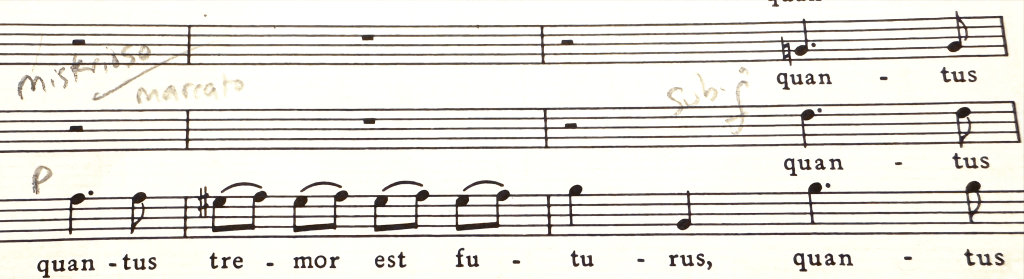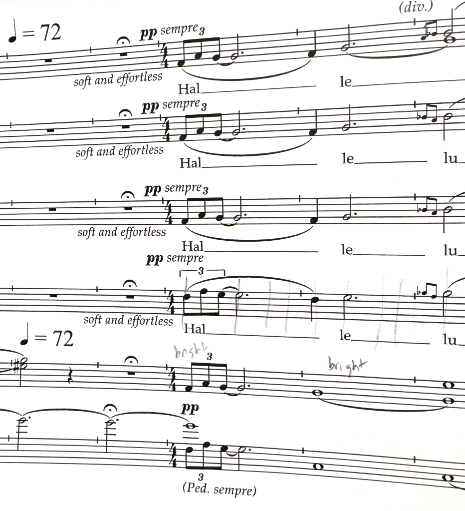 Unlike re-learning the Mozart Requiem—where you can choose from hundreds of different recordings, all with idiosyncracies that don’t match your current conductor’s choices—Love Canticles has no recordings, having just been finished a few months ago. We’re the first voices to give shape to these markings, dynamics, and gestures. It’s up to us to breathe life into the dots on the page.
