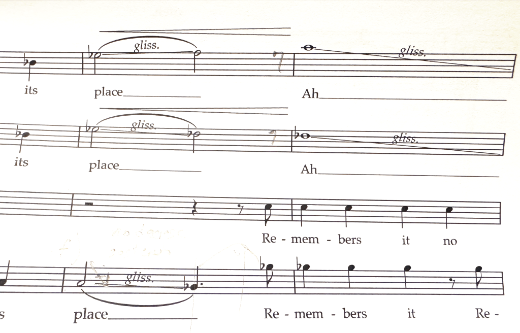 First, her use of the glissando. At several points, Vrebalov emphasizes an interval or transition by asking the chorus to glide between notes. Unlike a portamento (a more gradual, often expressive slide), these glissandi start immediately, even between two adjacent pitches. This controlled Doppler effect sends a subtle chill down the spine, especially when the resonance lines up just right.