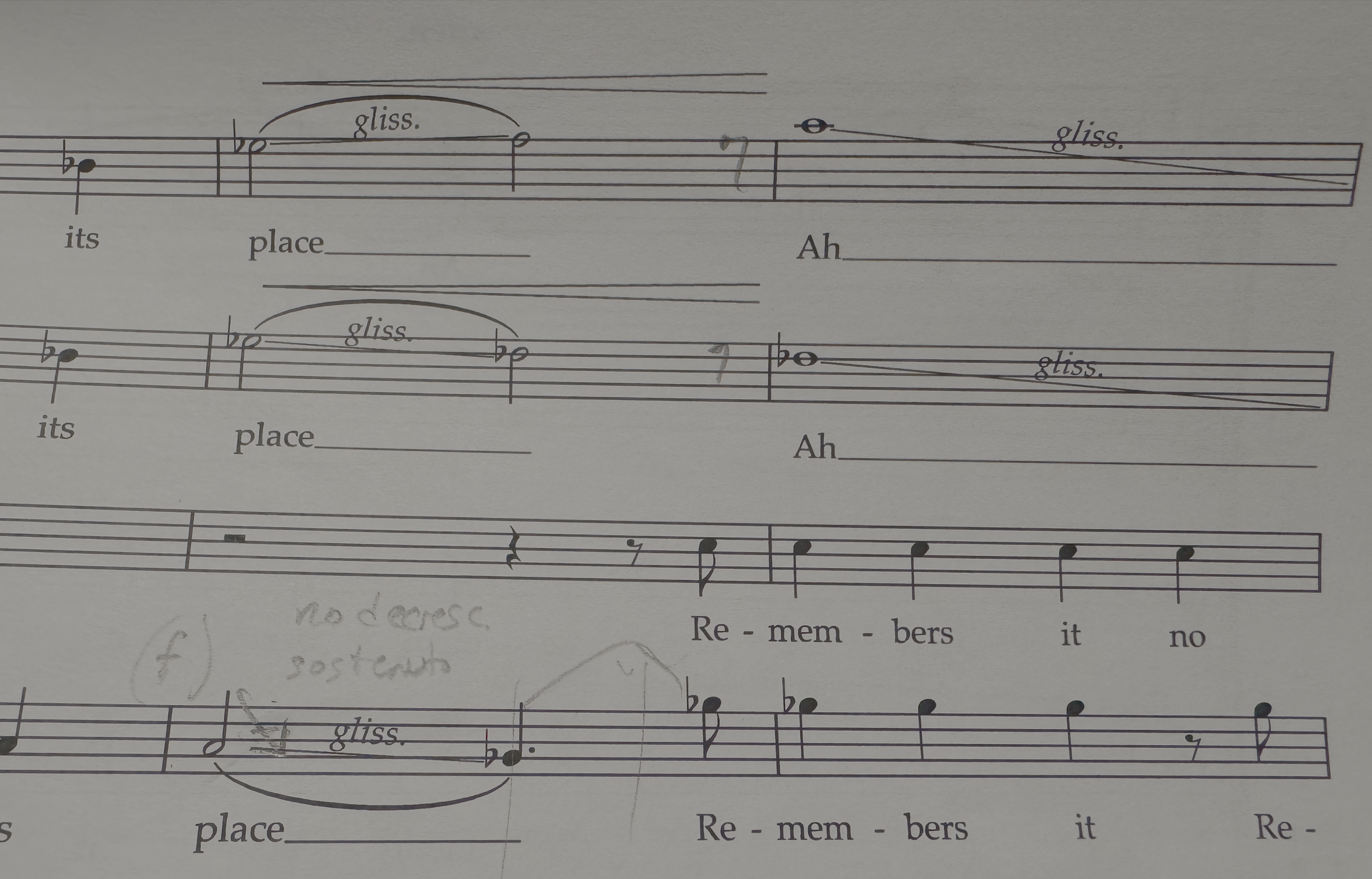 First, her use of the glissando. At several points, Vrebalov emphasizes an interval or transition by asking the chorus to glide between notes. Unlike a portamento (a more gradual, often expressive slide), these glissandi start immediately, even between two adjacent pitches. This controlled Doppler effect sends a subtle chill down the spine, especially when the resonance lines up just right.