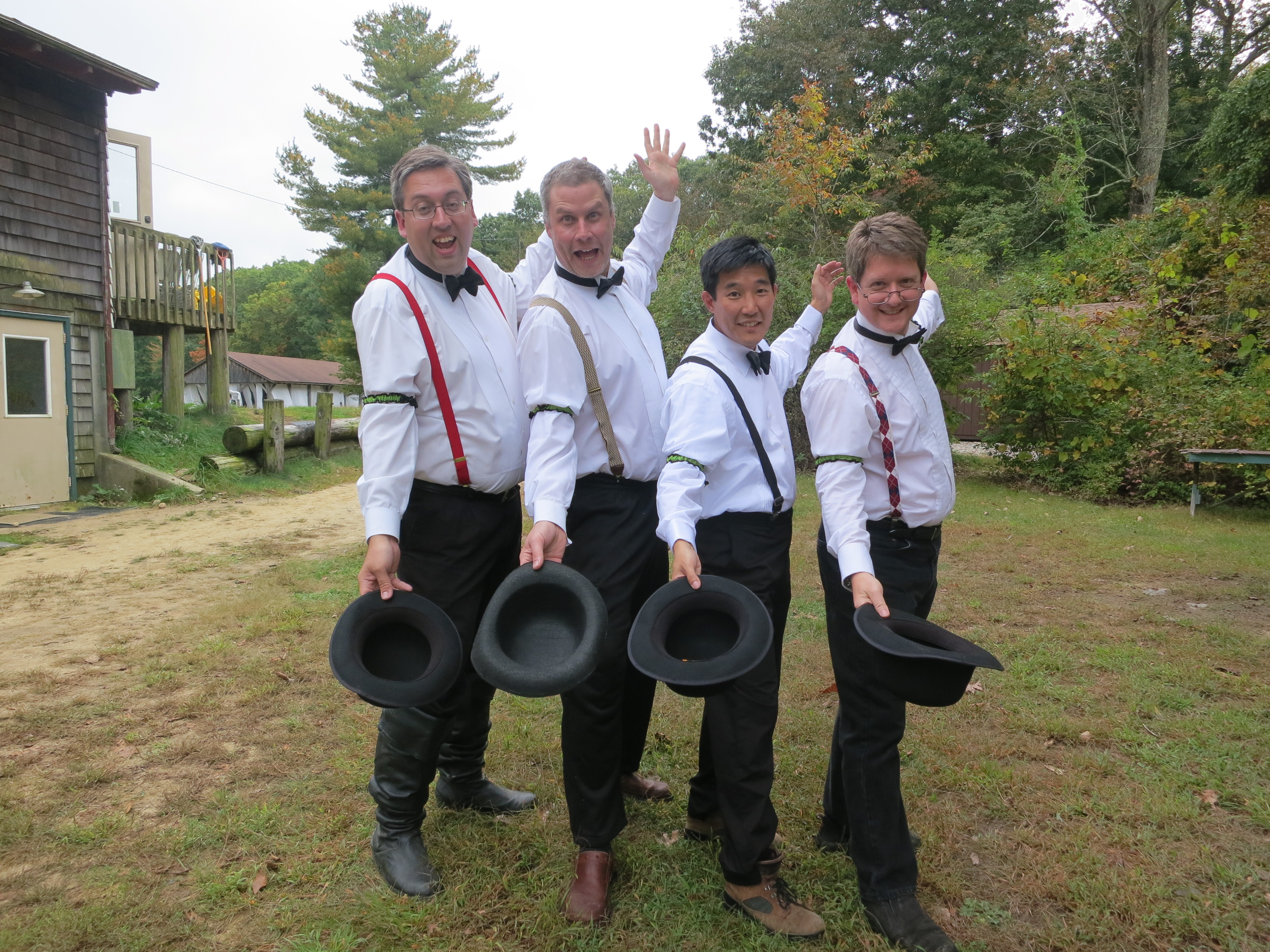 The Barbershop Quartet was equally challenging. Having never sung Barbershop before, I received some tutelage from fellow staffer Chris Reichert, whose “Notable Ring” quartet in Austin has won awards in a few regional contests. He recommended some tags, procured some music and learning tracks (which are awesome — left side, just your part; right side, other three parts), and coached all of us about the style: less vibrato, aiming for a ‘ringing’ on sustained chords, emphasizing the ‘sour’ notes whose dissonances drive the music forward, even such logistics as gathering together to find your opening pitch then spreading into a circle and nailing it. We were worried because when we first got together in person to practice, we discovered that it’s harder to sing your part with three other people who are also trying to learn their part, as opposed to a recording of three solid singers on a learning track. But with Chris’s coaching, we made it first to barely passable, then quite acceptable, and finally to knock-people’s-socks-off when we performed. To untrained singers, we were amazing. But even singers (and at least one participant who sang barbershop), we were top-notch. Another case where hours put into a labor of love paid off handsomely, even though we were only “on stage” for a few hours of episodic singing.